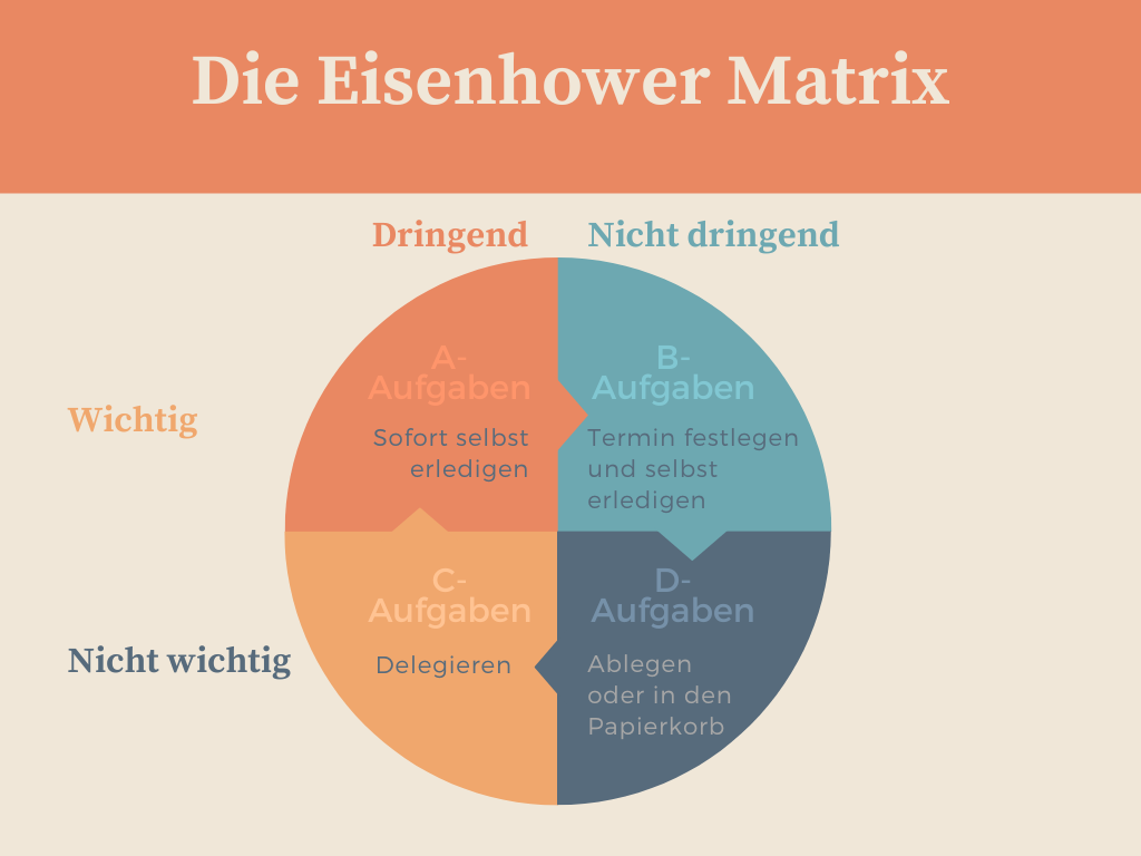 Eisenhower hat ein Prinzip erfunden, mit dem man auch sehr gut für sich selber herausfinden kann, welche Situationen, Dinge oder Aufgaben einerseits welche Wichtigkeit haben und andererseits auch welche Dringlichkeit in der Erledigung. Die folgende Matrix soll dies in vier verschiedenen Aufgaben einteilen: