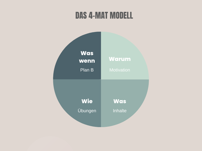 Das 4-Mat Modell beantwortet im Uhrzeigersinn die Fragen WARUM (Motivation/Sinn), WAS (Inhalte/Wissen), WIE (Übungen/Umsetzung) und WAS WENN (Plan B/Notfallplan). Wieso im Uhrzeigersinn? Weil davon ausgegangen wird, dass die meisten Menschen zuerst eine Motivation benötigen, um etwas umzusetzen, und sich erst dann mit anderen Fragen beschäftigen können. Solange die Motivation nicht geklärt ist, schwimmen wir im Unklaren.